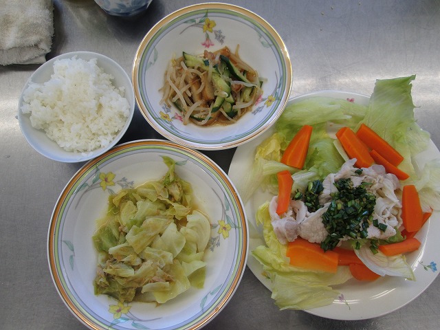 *豚しゃぶのにらじょうゆかけ *ツナとキャベツのカレー煮 *がんもどきのポン酢しょうゆ和え