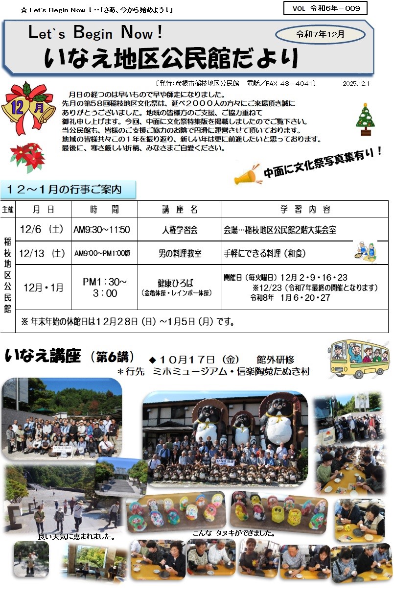 令和7年 夏休み工作教室 竹を使った工作 令和7年度出前講座紙ひこうき教室稲枝東小学校1年生 *館長が毎月楽しい話しを掲載します。11月1日掲載 公民館スタッフを紹介します。☺ 令和7年度 福寿大学令和7年度 閉講式 第6回 ふたつのそうぞく 公民館だより11月号 * 子ども110番の家 研修会 彦根市立稲枝 西小学校☺ 彦根市立稲枝 北小学校☺ 彦根市立稲枝 東小学校☺ 令和7年度 第6講 いなえ講座 10月17日(金) 館外研修 2024 稲枝ルミネ8月2日(金)~8月16日(金) 令和7年7月19日(土) 大型ヨット体験教室 花湖さんの打ち出のコヅチ令和7年度 第6回 神仏の居るところ ✈稲枝地区公民館上空から見た映像です。 自分の町を空からご覧下さい。