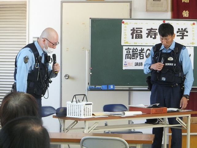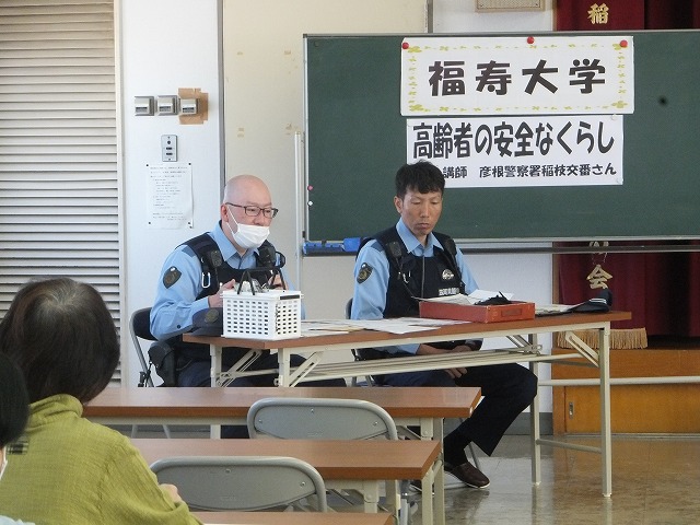 第1回 福寿大学「高齢者の安全なくらし」 令和6年5月10日(金)令和6年度 第1回 開講式 彦根警察署 稲枝交番所の 橋本・向井さん 実際に有った詐欺を寸劇☺で再現し勉強しました。 騙されないように!