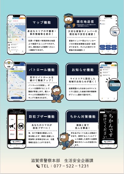 県内の犯罪発生情報、不審者情報等、防犯ブザー機能、ちかん対策機能