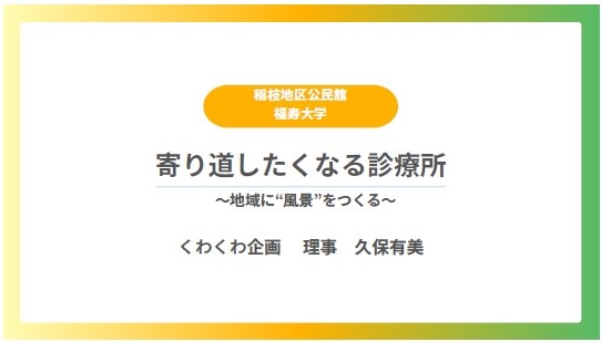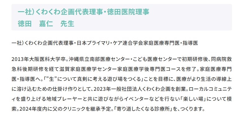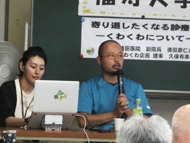 第4回 福寿大学「生き方」 徳田医院 副院長 徳田嘉仁さん 在宅医療カレッジ HPより掲載 診療所でもあり、住まいでもあり、遊び場でもある場所 思い思いに訪れ「ただ居る」ことのできる場所 まちとゆるく繋がる「みんなの縁側」