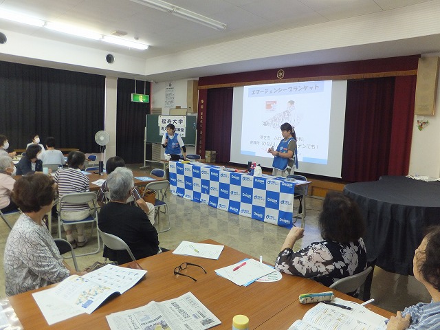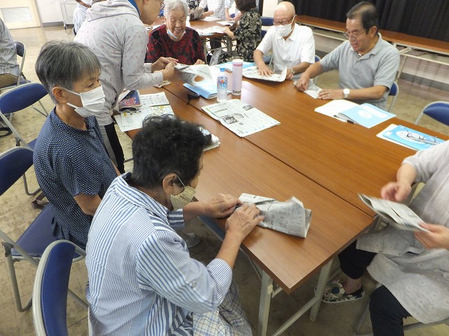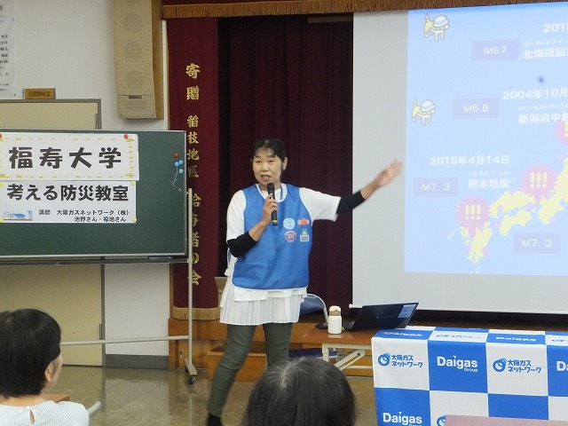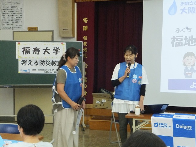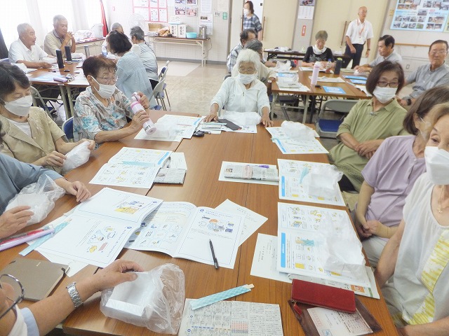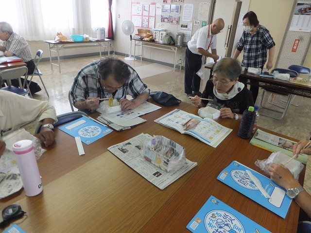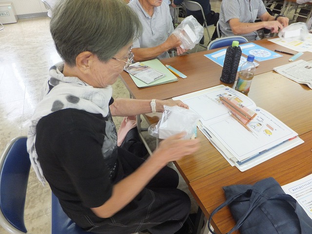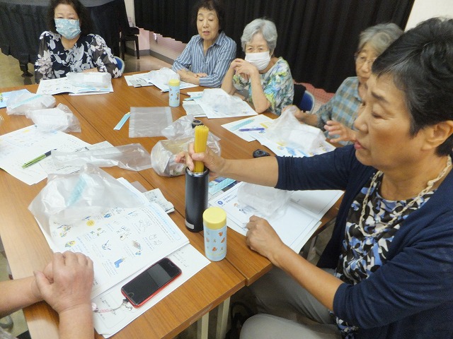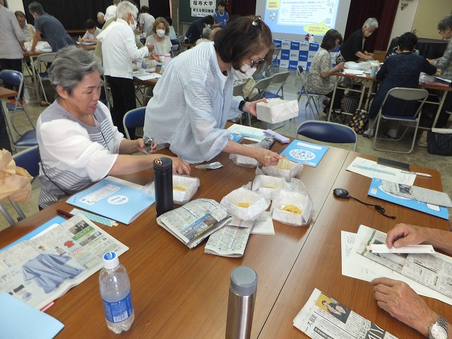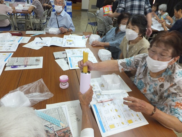 第5回 福寿大学「考える防災教室」 大阪ガスネットワーク(株) 大きな災害が起こると、当たり前にできていた普段の生活ができなくなります。 知恵と工夫でライフラインのとまった生活を乗り切ろう! 新聞紙のスリッパ・紙食器を作ります。 お湯を入れて3分で作れる、パスタを水筒(魔法ビン)で作ります。