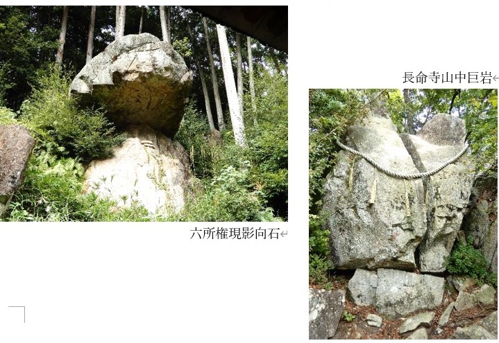 神の住む山・六所権現影向石(本堂の背後。武内宿襺が長寿を祈願したとされる岩)