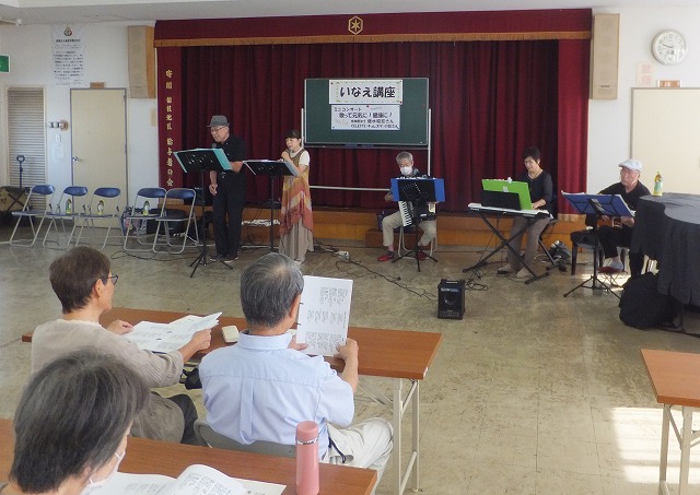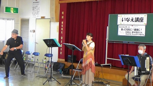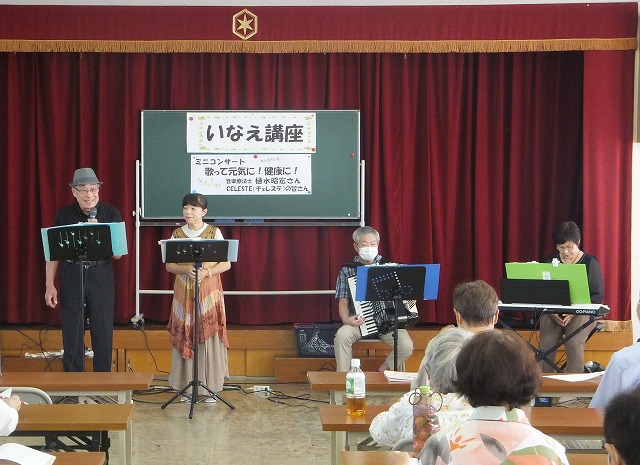 第5回 いなえ講座「ミニコンサート 歌って元気に!健康に!」 講師は音楽療法士♫樋水昭宏さんとCELESTE(チェレステの皆さん) みんなで歌い手足を動かして楽しく運動しました。(^^♪