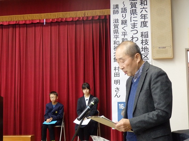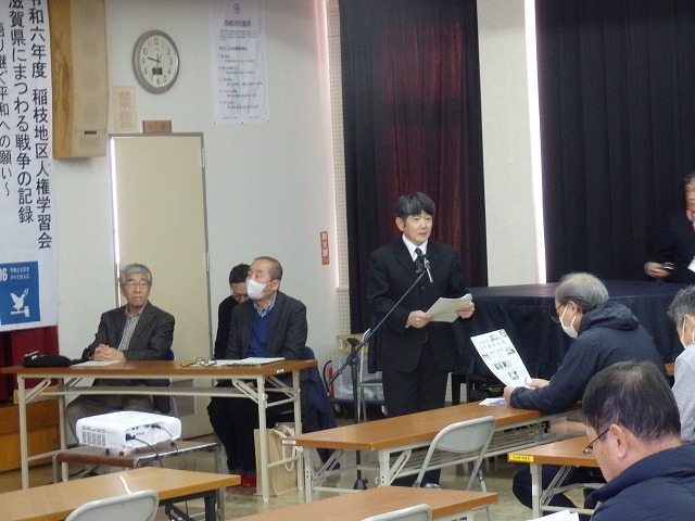 稲枝地区地区人権学習令和6年12月7日(土) 稲枝地区公民館2F大会議室 稲枝地区連合自自会 会長 青木さん 彦根市人権尊重都市宣言唱和 *田中さん