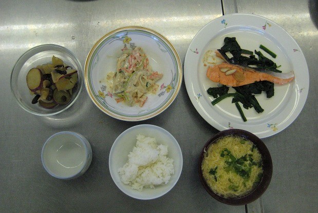 *鮭のソテー *れんこんサラダ *すまし汁 *さつまいものりんご煮